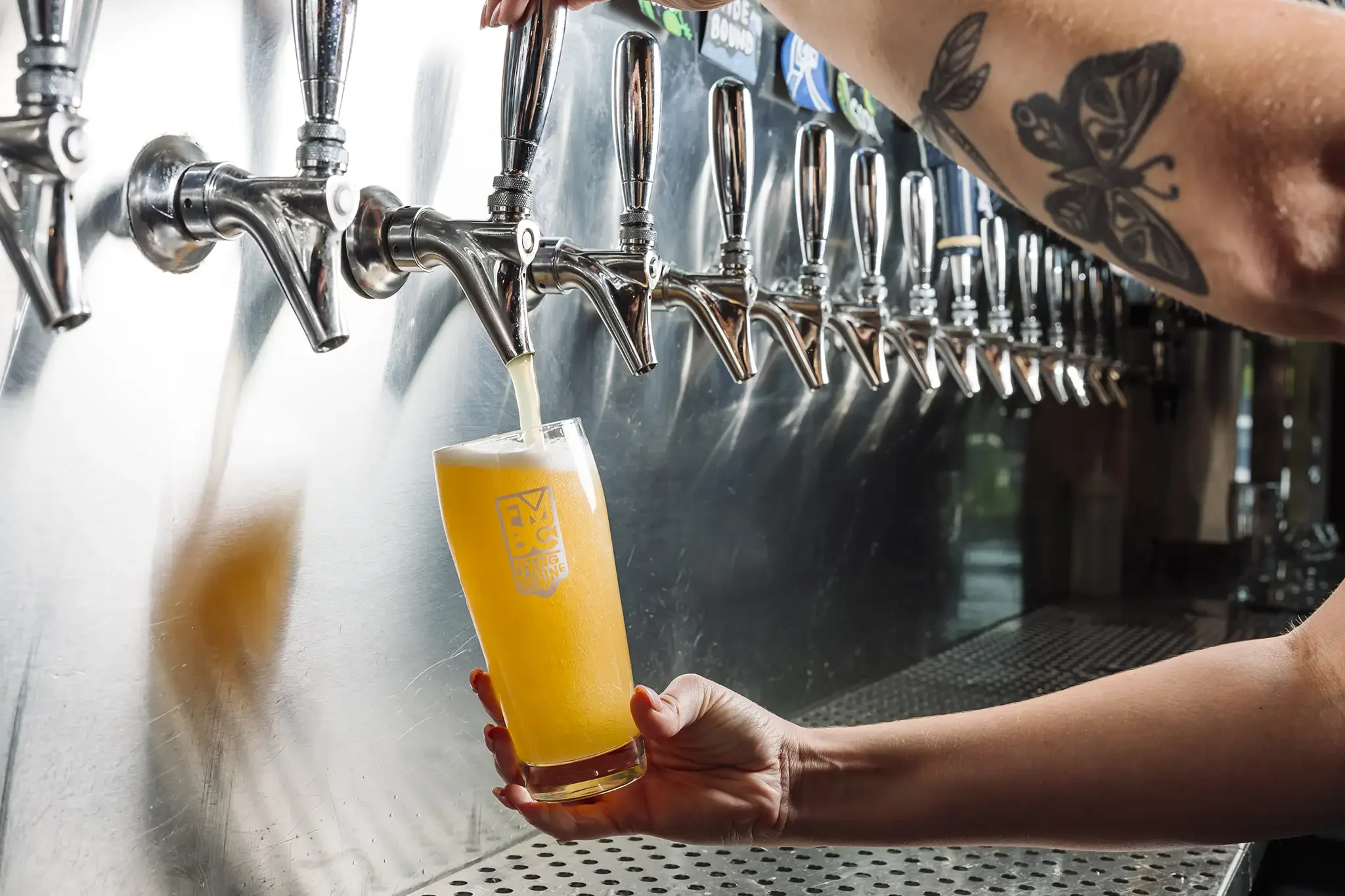 A person with a tattoo on their arm pours beer from a tap into a glass at a brewery.